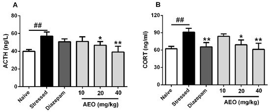 2.9. Effects of AEO on ACTH and CORT Concentrations in the Serum of Restraint Stress-Induced Mice