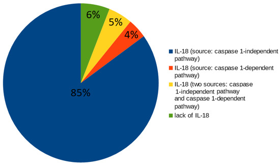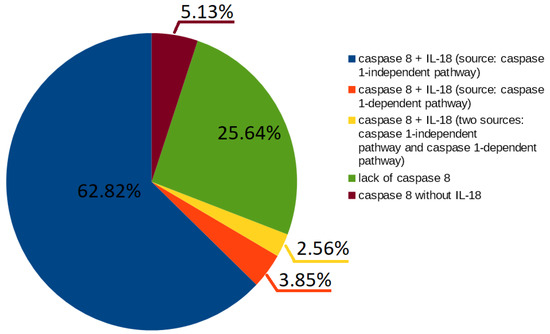 Caspase 8 presence is also interesting; 74% t-invariants correspond to subprocesses in which caspase 8 is engaged. Furthermore, caspase 1-independent pathway seems to be associated with caspase 8. More than half of t-invariants (62.82%) correspond to subprocesses in which caspase 8 occurs along with IL-18 produced by caspase-1 independent pathway (these results have been presented in Figure 2):