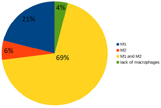 Thirteen (87%) out of 15 t-clusters include t-invariants corresponding to subprocesses in which macrophages are engaged: one cluster includes type M1 of macrophages, four clusters include type M2 and eight clusters include both types of macrophages. The analysis of t-invariants showed that 96% t-invariants correspond to subprocesses in which macrophages are engaged. To be precise, macrophages are associated with almost all mechanisms, which are included in the proposed model (these results have been presented in Figure 3):