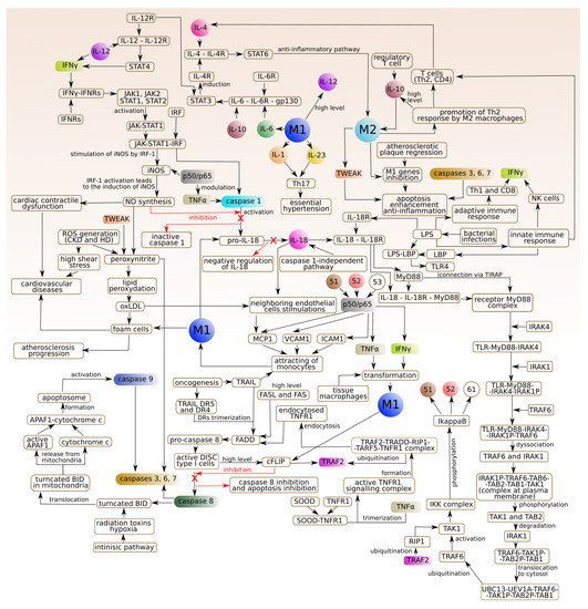 The proposed model has been divided into parts corresponding to the biological phenomena: (a) Janus kinases and signal transducer and activator of transcription (JAK-STAT) pathway stimulated by interferon gamma (IFN); (b) innate immune responses; (c) p50/p65 translocation to the nucleus in macrophages M1, smooth muscle cell (SMC) and endothelial cell (EC); (d) gram-negative bacterial infections; (e) activation of nuclear factor kappa-light-chain-enhancer of activated B cells (NF-B)—the canonical pathway via IB phosphorylation by kinase complex (IKK) (MyD88-dependent signaling pathway); (f) activation of caspase 1 (by tumor necrosis factor (TNF) and also by binding with STAT binding element (SBE) sequences of interferon regulatory factor I (IRF1); (g) IL-18 synthesis (caspase 1-dependent pathway); (h) IL-18-IL-18R complex formation; (i) negative regulation of IL-18 (by inhibition of caspase 1) caused by nitric oxide (NO); (j) NO synthesis; (k) cardiovascular disease influenced by NO-dependent pathway; (l) TNF receptor-associated factor 2 (TRAF2) and receptor-interacting serine/threonine-protein (kinase 1 (RIP1) ubiquitination; (m) macrophages polarization; (n) lipid peroxidation (oxLDL); (o) IL-18 synthesis (caspase 1-independent pathway) and neighboring endothelial cells stimulation; (p) regulation of TNFR1 signaling; (r) the role of IL-1, IL-23, IL-6, high level of IL-10 and IL-12 (released by classically activated macrophages M1); (s) atherosclerosis progression; (t) attracting of monocytes (classically activated macrophages M1); (u) formation of apoptosome and activation of effector caspases 3, 6, 7; (w) high level of active caspase 8; (x) inhibition of caspase 8 and inhibition of apoptosis (by a high level of cFLIPs); (y) STAT6 upregulation promotes M2 macrophage polarization to suppress atherosclerosis.
