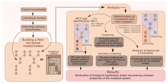 - Grafahrend-Belau, E.; Schreiber, F.; Heiner, M.; Sackmann, A.; Junker, B.H.; Grunwald, S.; Speer, A.; Winder, K.; Koch, I. Modularization of biochemical networks based on classification of Petri net t-invariants. BMC Bioinform. 2008, 9. [Google Scholar] [CrossRef] [PubMed]