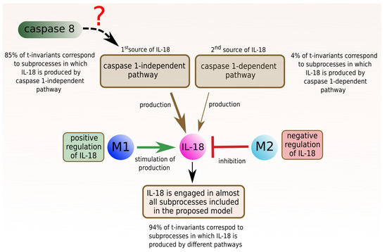The analysis of t-clusters for the proposed model revealed that 12 (80%) out of 15 clusters include t-invariants corresponding to the subprocesses in which IL-18 is involved. The more detailed analysis is a manual method, which is based on searching for particular t-invariants in every t-cluster. This method leads to determination, which, of the subprocesses, are crucial for the modeled system, which is confirmed by the high percentage value. In this case, the more detailed analysis of t-invariants showed that 94% of t-invariants correspond to subprocesses in which IL-18 is engaged. To be more precise, IL-18 is associated with almost all mechanisms and processes, which are modeled in the proposed Petri net based model (the results are presented in Figure 1):