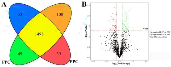 In total, 1739 proteins were identified. Of these proteins, 1586 co-existed in both the PPCs and FPCs; 53 solely in the PPCs and 100 in the FPCs (Supplementary S1). Of the 1586 proteins, 39 were significantly up-regulated in PPCs (p < 0.05) and 49 significantly up-regulated (p < 0.05) in the FPCs (Figure 1). Therefore, we obtained 241 (53 + 100 + 39 + 49) DEPs in total. All identified proteins were annotated online (available online: http://david.abcc.ncifcrf.gov/, accessed on 9 February 2018), and GO terms containing the key words “plasma membrane” were deemed to be plasma membrane proteins. In the PPCs, plasma membrane proteins accounted for 40.9% (671 out of 1639), and in the FPCs for 40.6% (685 out of 1686). We evaluated the proteomics of PPCs reported by Dong et al. [] in the same way, and found that 16.3% (407 out of 2500) were plasma membrane protein.