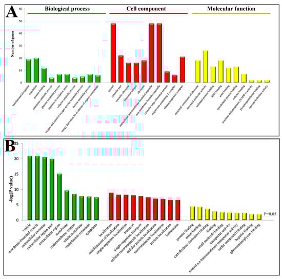 Gene ontology (GO) annotation and enrichment of DEPs were carried out using online software (available online: http://david.abcc.ncifcrf.gov/, accessed on 9 February 2018). A total of 226 GO terms were significantly enriched (p < 0.05). Of these, 124 were involved in “biological processes”, 17 in “molecular function” and 85 in “cellular component” (Supplementary S2). The top 10 GO terms from each category were selected (Figure 2) and showed that the predominant terms in “cell component” were membrane or membrane associated proteins; in “biological processes” were localization and transport proteins; and in “molecular function” were binding proteins.