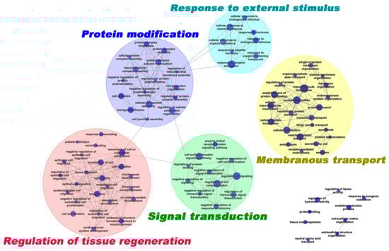 The enriched GO terms were further grouped using the EnrichmentMap plusin tool in Cytoscape 3.1.1 [,] to generate a weighted similar network (Figure 3). Five representative clusters were generated: (1) in response to external stimulus (8 terms); (2) signal transduction (11 terms); (3) membranous transport (23 terms); (4) regulation of tissue regeneration (24 terms); and (5) protein modification (16 terms).