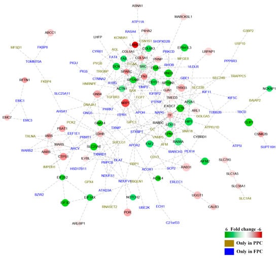 Interaction network of DEPs in the PPCs vs. FPCs. The panorama network consists of 159 DEPs, including 28 up-regulated proteins, 38 down-regulated proteins in the PPCs, 35 solely detected in the PPCs (