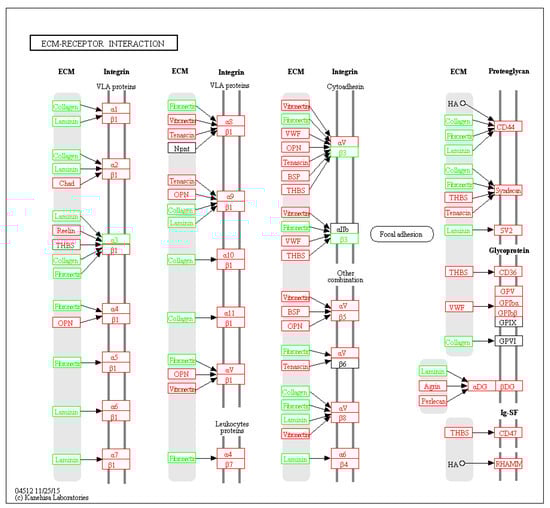 Six pathways of the KEGG were significantly enriched (p < 0.05) from the DEPs (Table 1). The extracellular matrix (ECM)-receptor interaction signal pathway significantly dominated and seven related proteins were differentially expressed (Figure 5). For some signal pathways, such as PI3K/AKT and VEGF, although not significantly enriched, key node proteins in the pathways were differentially expressed (Figure S1). Transcriptome data published by our laboratory [] were used to map whole signal pathways.
