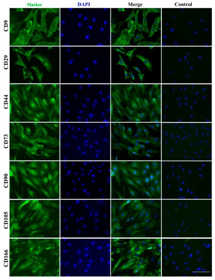 Immunofluorescent staining of surface stem cell markers. CD9, CD29, CD44, CD73, CD90, CD105 and CD166 were detected with their antibodies, and nuclei were counterstained with DAPI. Bar = 100 μm.