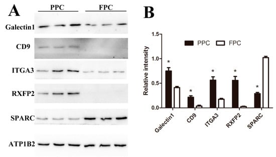 To validate expression levels of our detected DEPs, five proteins (Galectin1, CD9, ITGA3, RXFP2, and SPARC) were confirmed using Western blotting (Figure 7). CD9 and Galectin1 were reported to be expressed in the ASCs previously [], ITGA3 and SPARC are critical node-proteins from the network (Figure 4), and RXFP2 could be used as the special marker for ASCs []. Expressions of Galectin1, CD9 and ITGA3 were found to be up-regulated in the PPCs, while SPARC was down-regulated, and RXFP2 was undetectable in the FPCs (Figure 7A). All five proteins (PPCs vs. FPCs) were highly significantly differentially expressed (p < 0.01; Figure 7B). Expression of CD9, ITGA3, RXFP2 and SPARC was consistent with those of LC–MS/MS results. Galectin-1 was found to be overexpressed (2 fold) in the PPCs vs. FPC, but did not reach a significant level (p = 0.054).
