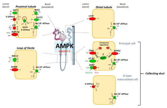 AMP-activated kinase (AMPK) is a serine/threonine kinase that is expressed in most cells and activated by a high cellular AMP/ATP ratio (indicating energy deficiency) or by Ca2+. In general, AMPK turns on energy-generating pathways (e.g., glucose uptake, glycolysis, fatty acid oxidation) and stops energy-consuming processes (e.g., lipogenesis, glycogenesis), thereby helping cells survive low energy states. The functional element of the kidney, the nephron, consists of the glomerulus, where the primary urine is filtered, and the proximal tubule, Henle’s loop, the distal tubule, and the collecting duct. In the tubular system of the kidney, the composition of primary urine is modified by the reabsorption and secretion of ions and molecules to yield final excreted urine. The underlying membrane transport processes are mainly energy-consuming (active transport) and in some cases passive. Since active transport accounts for a large part of the cell’s ATP demands, it is an important target for AMPK. Here, we review the AMPK-dependent regulation of membrane transport along nephron segments and discuss physiological and pathophysiological implications.