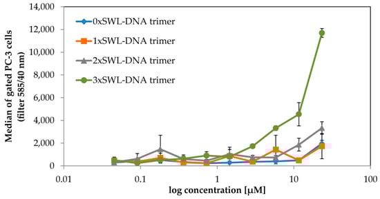 PC-3 cells are known to overexpress EphA2 receptors [] and to confirm this, we initially probed its expression using a phycoerythrin (PE) labeled anti-human EphA2 antibody in flow cytometry experiments. As a negative control HL-60 cells, which should only express these receptors after maturation [], were tested and the expected lack of expression was confirmed compared to PC-3 cells (Figure A5). EphA2 expressing PC-3 cells were then treated with different concentrations of DNA trimers carrying both a Cy3 dye and between 0–3 SWL peptides and were subsequently analyzed via flow cytometry (Figure 2). As expected, binding curves revealed that the construct with three SWL peptides (3xSWL-DNA) displays highest binding activity. In comparison, the binding activity of structures carrying one SWL peptide is nearly indistinguishable from nonspecific interactions occurring between the bare DNA trimer and cells. Structures carrying two peptides do display moderate binding, although at approximately one-quarter of the levels of the three-peptide structures at the highest concentration.