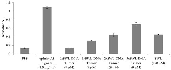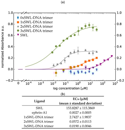 Furthermore, the phosphorylation of EphA2 receptors resulting from the application of different concentrations of the ligands enabled the calculation of approximate EC50 values for the DNA-peptide constructs by least-square analysis (Figure 4, Equation (1)) []. As expected, 3xSWL-DNA trimers led to the highest phosphorylation signal (EC50 = 0.0190 ± 0.0046 µM), i.e., overall efficacy, followed by 2xSWL-DNA trimers (EC50 = 0.0572 ± 0.0113 µM) and 1xSWL-DNA trimers (EC50 = 2.7427 ± 1.9837 µM) for concentrations up to 30 µM. For SWL, concentrations up to 500 µM were tested and fitting revealed an EC50 value of 153.8287 ± 115.3869 µM. DNA trimers without any SWL (0xSWL-DNA trimer) did not evoke phosphorylation of EphA2 receptors, and accordingly the absorbance signal is within the background (approximately 0 in Figure 4a). Appendix Figure A7 presents the data obtained for the natural ligand ephrin-A1 (EC50 = 0.0027 ± 0.0005 µM).