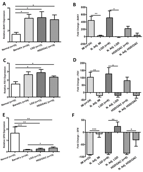 Global mitochondrial function gene expression across the disease sequence in diseased (A,C,E) versus matched normal adjacent (B,D,F) in vivo samples. (A) BAK1 (p < 0.05), (C) FIS1 (p < 0.05) and (E) SFN (p < 0.0001) were found to be differentially expressed between independent groups in the Barrett’s disease sequence (Mann Whitney U) (Dunns post-hoc test). Kruskal-Wallis tests were used to investigate differences across the in vitro Barrett’s sequence for BAK1 (p = 0.037), FIS1 (p = 0.108) and SFN (p < 0.0001). (B) BAK1 (p < 0.01), (D) FIS1 (p < 0.01) and (F) SFN (p < 0.001) were found to be differentially expressed across the Barrett’s disease sequence compared to matched normal adjacent samples (Wilcoxon Sign Rank). Bars denote mean ± SEM. * p < 0.05, ** p < 0.01 and *** p < 0.001.