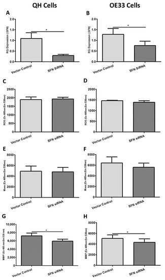 Figure 5 shows the functional effect of SFN siRNA knockdown on ROS production, mitochondrial mass and MMP in the Barrett’s and OAC cell lines. siRNA-induced knockdown of SFN resulted in a significant reduction in SFN expression in both the QH (Figure 5A) (p = 0.049) and OE33 (Figure 5B) (p = 0.025) cell lines of 73% and 41% respectively compared to unscrambled control treated cells. As with BAK1 and FIS1, knockdown of SFN significantly decreased MMP (Figure 5G) (p = 0.049) but did not alter ROS levels (Figure 5C) or mitochondrial mass (Figure 5E) in QH cells. However, knockdown of SFN significantly decreased MMP (Figure 5H) (p = 0.022) without affecting ROS levels (Figure 5D) or mitochondrial mass (Figure 5F) in OE33 cells.