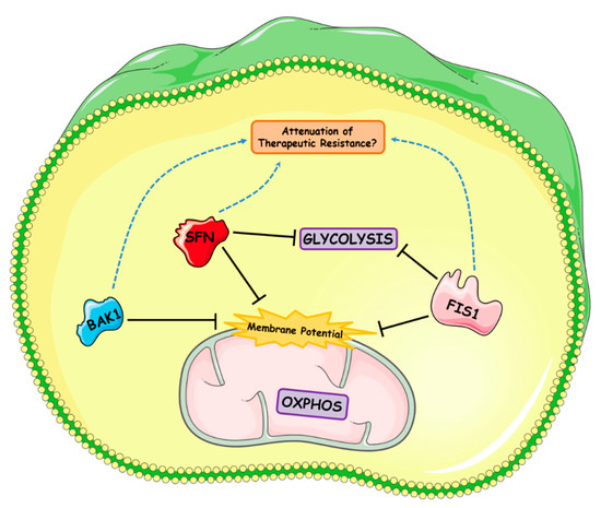 Summarizing the effect of BAK1, FIS1 and SFN knockdown on mitochondrial function and cellular metabolism. Utilizing qPCR gene microarray screening, we screened 84 mitochondrial genes across the in vitro intestinal metaplasia-dysplasia-adenocarcinoma disease sequence and identified three genes as being differentially expressed: BAK1, FIS1 and SFN. Moreover, upon further validation we found BAK1, FIS1 and SFN were differentially expressed across the in vitro and in vivo intestinal metaplasia-dysplasia-adenocarcinoma disease sequence. These three genes were subsequently knocked down in vitro in Barrett’s (QH) and adenocarcinoma (OE33) cell lines to gain some insight into their potential role on mitochondrial function. We found that siRNA-induced knockdown of the three genes significantly decreased mitochondrial membrane potential in the Barrett’s cell line; thus, inhibition of BAK1, FIS1 or SFN function may potentially make these cells more vulnerable to apoptosis in intestinal metaplasia or upon subsequent neoplastic progression. SFN knockdown also reduced baseline glycolysis in adenocarcinoma cells. Based on many previous studies, however, these three genes may also play an important part in conferring therapeutic resistance. Therefore, reagents that target these genes and their encoded products may help attenuate any harmful effects they encompass. Image produced with the aid of Servier Medical Art software (see copyright license at https://smart.servier.com).