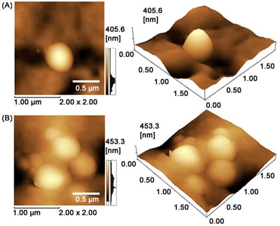 The well-defined spherical morphology and smooth surface of free-drug PLGA nanoparticles and MET-loaded PLGA nanoparticles can be directly observed in an atomic force microscope (AFM) image (Figure 1). Table 1 showed that the mean diameter of MET-loaded PLGA nanoparticles was in the range of 457.1 ± 48.9 nm (p < 0.05), with a polydispersity index of 0.285 ± 0.12 (p < 0.05), Z potential of 8.16 ± 1.1 mV (p < 0.01), and entrapment efficiency (EE) of 66.7 ± 3.73 (Table 1). These results suggest that the addition of MET (metformin) in the core slightly affected the particle sizes (p > 0.05). The mean particle size of MET-loaded PLGA nanoparticles was slightly larger than that of pure empty PLGA nanoparticles, indicating the presence of MET in the hydrophilic core of the nanoparticles [,].
