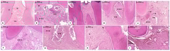 Microscopic analyses. Histopathological aspects of the periodontal control and treated groups. (A) Sham Group: Displaying usual aspects; (B) PD group without DM; (C) DM group without PD: Displaying usual aspects; (D) DM group with PD: Positive control; (E) Met 50 group; (F) Met 100 group: Lower scores; (G) PLGA (DM group with PD); (H) DM group with PD + PLGA + 10 mg/kg Met group; and (I) DM group with PD + PLGA + 100 mg/kg group. Disorganization of connective tissue and intense inflammatory infiltrate (**); alveolar bone destruction (***); (▸) destruction of cement; (→) Giant multinucleated cell; a: Alveolar bone; c: Cement; d: Dentin; p: Pulp; tc: Connective tissue. * p < 0.05, ** p < 0.01, *** p < 0.00. Hematoxylin and eosin stain (H&E), 200×; PD = periodontal disease; DM = diabetes mellitus.