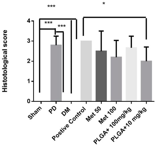 Histopathological score. Sham Group, PD group without DM; DM group without PD; DM group with PD: positive control; Met 50; Met 100; PLGA + 10 mg/kg Met; PLGA + 100 mg/kg. * p < 0.05; *** p < 0.001. (Kruskal–Wallis test followed by Dunn’s test).