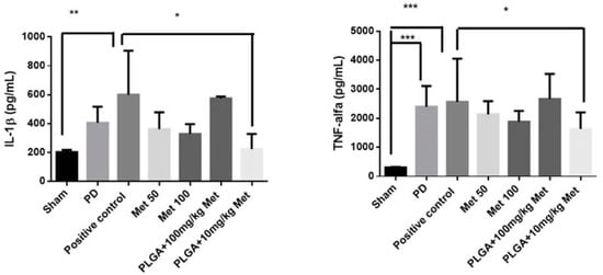 IL-1β and TNF-α levels in Sham, PD; positive control; Met 50; Met 100; PLGA + 10 mg/kg Met; PLGA + 100 mg/kg. * p < 0.05, ** p < 0.01, *** p < 0.001. Analysis of variance/ANOVA test followed by Bonferroni test.