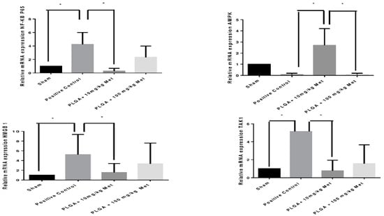 Real-time RT-PCR analysis of gene expression. Met effects on NF-κB p65, AMPK, HMGB1, and TAK-1 mRNA expression in rats. The expression of NF-κB p65 mRNA was decreased in PLGA + 10 mg/kg compared to the positive control group (* p < 0.05). The expression of AMPK mRNA was increased in PLGA + 10 mg/kg group (* p < 0.05) and decreased in positive group and PLGA + 100 mg/kg group. HMGB1 mRNA levels appeared to be lower in the PLGA + 10 mg/kg group compared to those in the positive control group (* p < 0.05,). TAK-1 appeared to be lower in the PLGA + 10 mg/kg group compared to that in the positive control group (* p < 0.05,) (n = 5 animals per group; ANOVA test followed by Bonferroni).