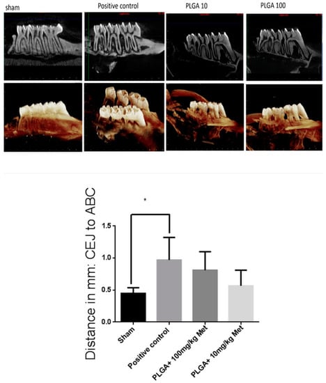 In this stage, the control groups (Sham and positive control) and experimental groups (PLGA + 100 mg/kg Met and PLGA + 10 mg/kg met) were included. Animals were euthanized at the end of the experiment (10 days after addition of the ligature and first drug treatments); maxillae were dissected and fixed in 10% buffered formalin for 24 h and stored in 70% alcohol. Rat maxillae were scanned using microcomputed tomography (µCT, micro-CT) (Model 1172; SkyScan, Kontich, Belgium) at 20 micrometers resolution. Micro-CT files were converted to Digital Imaging and Communications in Medicine (DICOM) files and imported into Dolphin® software (Toronto, ON, Canada, Version 6.5) for linear bone height analysis. Linear bone height analysis was performed by positioning the second molar cementoenamel junctions (CEJ) parallel to each other in the coronal plane. In the axial plane, the middle of the crown was identified and linear bone distances were recorded on the mesial aspect of the second molar on the sagittal image. Additional measurements were taken 0.3 mm palatal from the middle of the crown, again recording the mesial aspect of the second molar on the sagittal image. The linear measurements were recorded from the CEJ to the alveolar crest (AC). Each second molar received a total of two measurements, and these values were averaged for each group. The images were analyzed using CTAn (V.1.16 Bruker, Billerica, MA, USA). A 40-slice volume set at a threshold of 75 in the bifurcation area of the second molar was used as a region of interest for analysis (n ≥ 3/group for all µCT analyses).