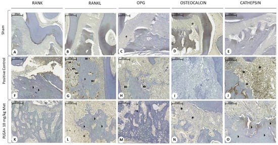 The sham group showed immunostaining absence for RANK, RANKL, OPG, and cathepsin, and low staining for osteocalcin. The positive control group showed intense immunostaining for RANKL and cathepsin, more significantly than the Sham group (p < 0.001) and the PLGA + 10 mg/kg Met group (p < 0.05). The PLGA + 10 mg/kg Met treatment resulted in low staining of RANKL, OPG, osteocalcin, cathepsin, and osteocalcin (Figure 7 and Figure 8). Immunohistochemical analysis revealed nuclear and cytoplasmic immunoexpression in periodontal connective and bone tissue cells with a diffuse pattern of expression for all proteins in the evaluated specimens, with increased expression in the PLGA + 10 mg/kg Met group compared to positive control. Immunoreactivity to RANK was predominantly observed in osteocytes. RANK-L presented immunoexpression in osteocytes, osteoclasts, and mononuclear inflammatory cells. OPG demonstrated immunostaining in mononuclear inflammatory cells, osteoclasts, and also in osteoblasts present in the PLGA + 10 mg/kg Met group, where an area suggestive of osteoblastic paving was observed. Expression for osteocalcin was present in mononuclear inflammatory cells and cathepsin revealed immunoexpression in mononuclear inflammatory cells and osteocytes.