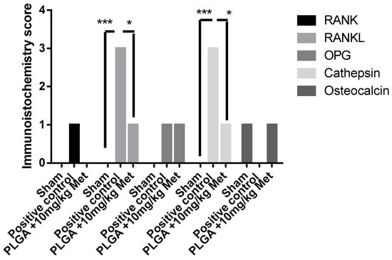 Immunohistochemistry score. Sham, positive control; PLGA + 10 mg/kg Met (* p < 0.05). (*** p < 0.001) (Kruskal–Wallis test followed by Dunn’s test).