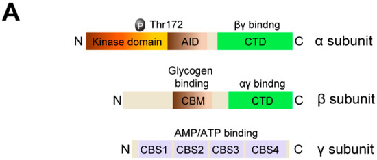 5′-AMP-activated protein kinase (AMPK), a serine/threonine kinase, is a key player in bioenergetic homeostasis to preserve cellular ATP [1]. AMPK is activated in response to an increased cellular adenosine monophosphate (AMP)/ATP or adenosine diphosphate (ADP)/ATP ratio, thus promoting catabolic pathways and suppressing biosynthetic pathways [1,2,3]. Mammalian AMPK exists as a heterotrimeric complex comprising a catalytic subunit α (α1 and α2), a scaffolding β subunit (β1 and β2), and a regulatory γ subunit (γ1, γ2, and γ3) (Figure 1A) [15]. Multiple isoforms of AMPK are encoded by distinct genes of the subunit isotypes, depending on the cell/tissue or species [16]. The AMPK subunit composition and ligand-induced activities of each AMPK isoform complex can differ among cell types, although the α1, β1, and γ1 isoforms are ubiquitously expressed [16,17].