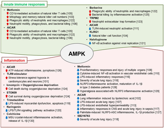 Treatment with trimetazidine protects against LPS-induced myocardial dysfunction, exerts an anti-apoptotic effect, and attenuates the inflammatory response due to its effect on the SIRT1/AMPK pathway [119]. Moreover, the flavonoid naringenin dampens inflammation in vitro and protects against murine endotoxemia in vivo; these effects are mediated by AMPK/ATF3-dependent inhibition of the TLR4 signaling pathway [120]. In severe acute HBV infection, halofuginone, a plant alkaloid, inhibits viral replication by activating AMPK-mediated anti-inflammatory responses [121]. AMPK activation also enhances the phagocytic capacities of neutrophils and macrophages [122]. Transient receptor potential melastatin 2, an oxidant sensor cation channel, promotes extracellular trap formation by neutrophils via the AMPK/p38 MAPK pathway, enhancing their antimicrobial activity [123]. AMPK activation not only modulates the acute inflammatory response but also promotes neutrophil-dependent bacterial uptake and killing [106].