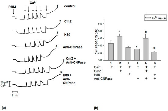 Effect of calmidozolium (CmZ), H89, anti-CNPase antibody, and their combined effect on Ca2+ capacity in rat brain mitochondria (RBM). Isolated RBM (1.0 mg/mL protein) were incubated in an electrode chamber under conditions described in Materials and methods. (a) Representative traces of Ca2+ fluxes in RBM. Arrows show the times at which CaCl2 was applied (the first addition, 50 nmol of Ca2+ per mg of protein; the subsequent addition, 100 nmol each of Ca2+ per mg of protein). (b) Quantitative analysis of Ca2+-capacity in the presence/absence of CmZ (30 μM), H89 (5 μM), and anti-CNPase antibody (0.18 µg/mL). The values shown are the means ± SD from three independent experiments; * p ≤ 0.05 vs. the Ca2+ retention capacity without any additions, # p ≤ 0.05 compared with the Ca2+-capacity in the presence of anti-CNPase antibody. CNPase: 2′,3′-cyclic nucleotide-3′-phosphodiesterase.