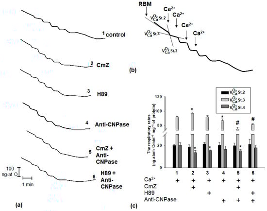 Effect of CmZ, H89, and anti-CNPase antibody, and their combined effect on respiratory activity in RBM. The conditions were the same as in Figure 1. (a) Representative curves of respiratory activities. (b) A schema of calculation of oxygen consumption in states VO2Ca St.2, VO2Ca St. 3, VO2Ca St. 4. (c) Quantitative analysis of respiratory activity in the presence/absence of CmZ (30 μM), H89 (5 μM), and anti-CNPase antibody (0.18 µg/mL). The values shown are the means ± SD from three independent experiments; * p ≤ 0.05 versus respiratory activity without any additions, # p ≤ 0.05 versus respiratory activity in the presence of anti-CNPase antibody.