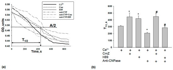 Effect of CmZ, H89, and anti-CNPase antibody, and their combined effect on RBM swelling. (a) Curves of RBM swelling in the presence of CmZ (30 μM), H89 (5 μM), and anti-CNPase antibody (0.18 µg/mL); (b) Average results of the half-time (T1/2) swelling. The values shown are the means ± SD from three independent experiments; * p ≤ 0.05 vs. T1/2 without any additions, # p ≤ 0.05 vs. T1/2 in the presence of anti-CNPase antibody. OD—optical density, A/2—half amplitude of mitochondrial swelling.