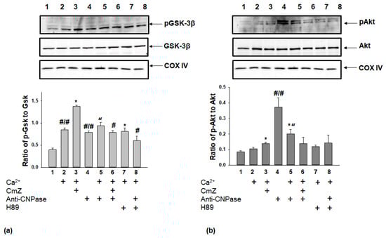 On the other hand, the pAkt/Akt ratio was reduced 1.85 times in the presence of the anti-CNPase antibody and Ca2+ loading (when mPTP was opened; column 5 vs. 4). When CmZ and H89 were used in combination with the anti-CNPase antibody, no significant changes in the Akt/Akt ratio were observed (columns 6 and 8 vs. 5).