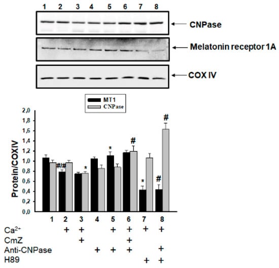 Effect of CmZ, H89, and anti-CNPase antibody, and their combined effect on the level of MT1 and CNPase in RBM. Upper part—western blot of a mitochondrial suspension after the isolation of RBM (see Materials and methods). Membranes were stained with antibody specific to Melatonin receptor A1 (MT1) and CNPase. Lower part—quantitation of immunostaining using computer-assisted densitometry. Bar graphs represent the immunoreactivity of MEL MT1 receptor and CNPase in RBM after the addition of CmZ (30 μM), H89 (5 μM), and anti-CNPase antibody (0.18 µg/mL). The protein band intensity was quantified after normalization with respect to COX IV. The values shown are the means ± SD from three independent experiments; #/# p ≤ 0.05 vs. MT1 level in in control conditions without any additions, * p ≤ 0.05 vs. the MT1 and CNPase levels in the presence of Ca2+. # p ≤ 0.05 vs. MT1 and CNPase levels in the presence of anti-CNPase antibody and Ca2+.