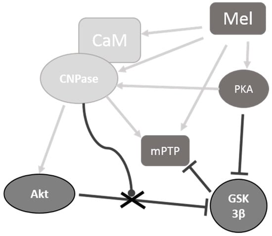 In summary (Figure 6), the addition of the anti-CNPase antibody led to a decrease in the threshold [Ca2+] decreased, and mitochondrial swelling was accelerated compared to the control, which agrees with the earlier made assumption that CNPase is involved in mPTP regulation []. The level of CNPase in the presence of the anti-CNPase antibody did not change, probably due to the binding of the antibody to the protein on the outer mitochondrial membrane. H89 enhanced the effect of the anti-CNPase antibody, while CmZ abolished the effect of the anti-CNPase antibody upon the mPTP opening. The anti-CNPase antibody in the presence/absence of CmZ and H89 upon the opening of mPTP in any event changed the level of pAkt and pGSK3β, which suggests the involvement of CNPase in the regulation of stress kinases. In the absence of anti-CNPase antibody we observed of correlation between pAkt/Akt and pGSK3β/GSK3β ratios. On the other hand, correlation between pAkt/Akt and pGSK3β/GSK3β ratios was broken when anti-CNPase antibody was added to mitochondria suspension. We suggest that CNPase may be involved in the regulation of these kinases. When the pore opened, the level of MEL decreased, whereas the level of CNPase remained unchanged. If the addition of CmZ to anti-CNPase antibody-loaded RBM did not alter the level of MEL, the level of CNPase increased, whereas H89 had an opposite effect on the levels of MEL and CNPase under these conditions. These results suggest the involvement of mitochondrial CNPase and MEL in the signal transduction upon the functioning of mPTP. The mechanism by which this can occur needs to be established.