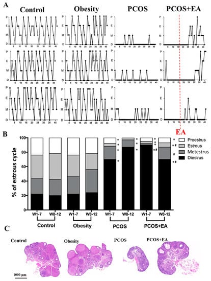 Pathological manifestations of the 5α-dihydrotestosterone (DHT)-induced polycystic ovary syndrome (PCOS) rat model and the effect of electro-acupuncture (EA). (A) Three typical oestrous cycle charts of rats from each group, P: Proestrus; E: Oestrus; M: Metestrus; D: Diestrus. (B) The ratio of Proestrus, Oestrus, Metestrus, and Diestrus stage to all observed oestrous cycles. All values are the mean ± standard error; * p < 0.05 vs. control group; # p < 0.05 vs. PCOS group. (C) Hematoxylin and eosin staining of paraffin-embedded sections from each group.