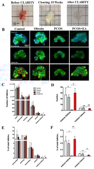 Ovaries began to become transparent after 8–12 weeks passive clearing (Figure 2A), and this allowed us to calculate the numbers of different kinds of follicles and their proportions (Figure 2B). As shown in Figure 2C, there were about 25 preovulatory follicles per ovary in the Control group and about 20 preovulatory follicles per ovary in the Obesity group, but none in the PCOS group (p < 0.05 compared with the Control group). After 4 weeks of EA treatments (Figure 2C,D), there was an average of 25 follicles per ovary in the PCOS-like-EA group (p < 0.05 compared with the PCOS-like group). There were about three CL in the Control group and Obesity group, 0 in the PCOS-like group (p < 0.01 compared with the Control group), and 2 in the PCOS-like-EA group (p < 0.01 compared with the PCOS-like group).