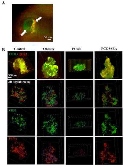 EA promotes angiogenesis in PCOS-like rat ovaries. (A) CD31 was used to stain the vasculature, and proliferating cell nuclear antigen (PCNA) was used to stain the neovasculature. The white arrows indicated the co-localization of PCNA with CD31 in one follicle. (B) Ovaries from rats from different groups after CLARITY processing and immunostaining using specific antibodies, followed by data transformation using the Imaris Filament algorithm. First row: 3D rendering of whole ovary images; second row: vasculature and neovasculature within the ovaries; third row: vasculature within each ovary; fourth row: neovasculature in each ovary.