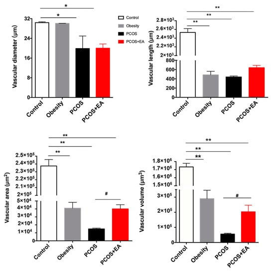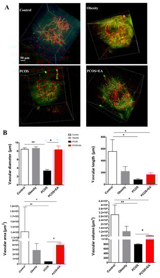 EA promotes angiogenesis surrounding the antral follicles. (A) Reconstruction of the neovasculature surrounding the antral follicles. (B) Quantification of the diameter, length, area, and volume surrounding antral follicles in the different groups. * p < 0.05 and ** p < 0.01 vs. the Control group; # p < 0.05 vs. the PCOS group.