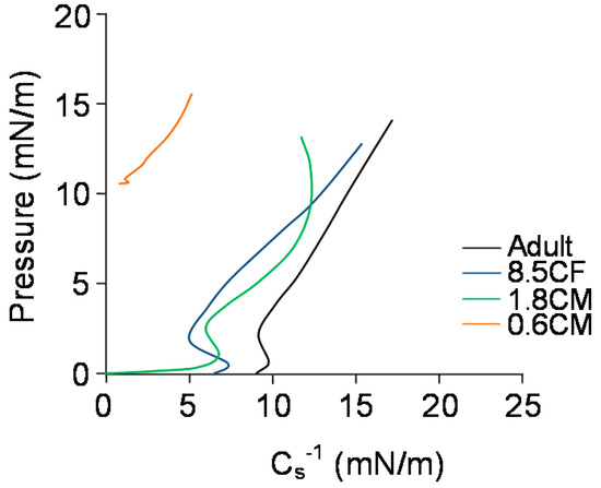 A plot of Cs−1 with surface pressure (Figure 4) showed that for the adult meibum sample, Cs−1 had an inflection after lift-off at low pressures (0–2 mN/m) and the maximal Cs−1 (17 mN/m) was achieved at Πmax of 14 mN/m. Sample 8.5CF showed a lower Cs−1 at lift off, had a longer inflection at similar low pressures and its maximal Cs−1 (15 mN/m) was achieved at a Πmax of 13 mN/m. Sample 1.8CM with a zero Cs−1 at lift off and two long inflections at two pressure ranges (lower 0–3 m and higher 10–13 mN/m) achieved its maximal Cs−1 (12 mN/m) at a Πmax of 13 mN/m. Sample 0.6CM with near zero Cs−1 at lift off and one inflection at higher pressures (10–11 mN/m) achieved its maximal Cs−1 (5 mN/m) at a Πmax of 15 mN/m.