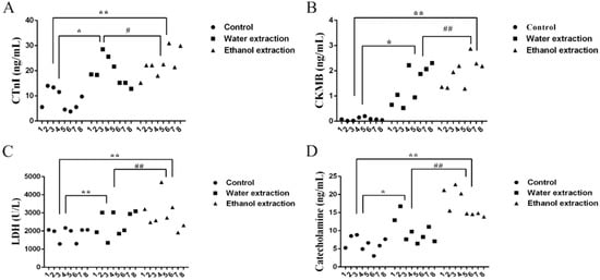 CTnI, CK-MB, LDH, and catecholamine levels in serum measured by ELISA and colorimetric analysis. (A) Representative figure of serum CTnI content. (B) Representative figure of serum CK-MB content. (C) Representative figure of serum LDH content. (D) Representative figure of serum catecholamine content. Data are expressed as mean ± SD, n = 8. * p < 0.05, ** p < 0.01 vs. control group; # p < 0.05, ## p < 0.01 vs. water extraction group.