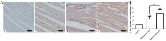 CTnI expression levels in the heart tissues in control, water extraction, and ethanol extraction groups. (A) Representative figure of CTnI immunohistological staining in heart (200×); 1: Negative group; 2: Control group; 3: Water extract group; 4: Ethanol extract group. (B) Statistic results of CTnI immunohistological staining (n = 8); data are expressed as mean ± SD. ** p < 0.01 vs. control group; ## p < 0.01 vs. water extraction group.
