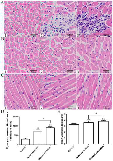 Histopathological examination of heart, HW/BW, and myocyte CSA. (A,B) Representative figure of myocyte cross-section (hematoxylin-eosin staining (HE) staining, 400×); (D) Statistic results of myocyte CSA. 1: Control group; 2: Water extraction group; 3: Ethanol extraction group; (C) Representative figure of myocyte long axis (HE staining, 400×); (E) Statistic results of HW/BW; data are expressed as mean ± SD, n = 8. ** p < 0.01 vs. control group; # p < 0.05, vs. water extraction group.