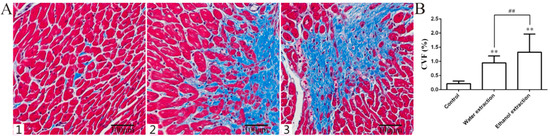 Masson’s trichrome staining of heart tissue and CVF. (A) Representative figure of myocardial fibrosis (Masson staining, 200×); (B) Statistic results of myocardial fibrosis (n = 8); 1: Control group; 2: Water extraction group; 3: Ethanol extraction group; data are expressed as mean ± SD. ** p <0.01 vs. control group; ## p < 0.01 vs. water extraction group.