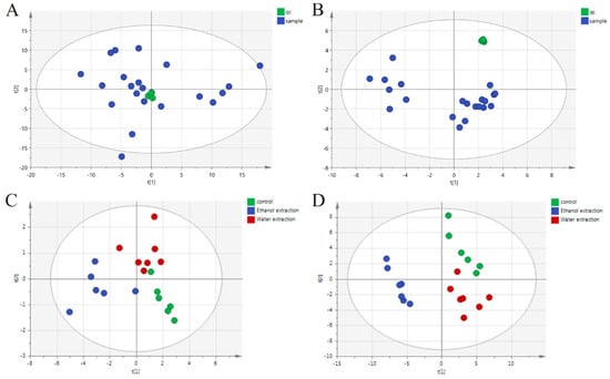 Multiple pattern recognition of the serum metabolites in the control, water extract, and ethanol extract groups on day 7. (A) QC of reversed phase C18 separation. (B) QC of hydrophilic chromatogram separation. (C) Representative figure of reverse phase C18 column detection chart. (D) Representative figure of hydrophilic chromatogram. Control group (green), ethanol extraction group (blue), water extraction group (red).