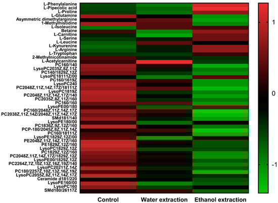Serum metabolites in the control, water extract, and ethanol extract groups. The concentration of small molecule metabolites in each group of rats was measured and treatment was normalized, and the −1 to +1 range was used to represent the contrast intensity; With reference to the ruler, the depth of the color represents the level of the content.
