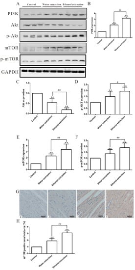 The PI3K/Akt/mTOR expression levels in the heart tissues in control, water extraction, and ethanol extraction groups. (A) PI3K, Akt, p-Akt, mTOR, and p-mTOR protein expression levels; (B–F) Quantitative analyses of PI3K, Akt, p-Akt, mTOR, and p-mTOR protein (n = 3); (G) Representative figure of mTOR immunohistological staining in heart (200×); 1: Negative group; 2: Control group; 3: Water extract group; 4: Ethanol extract group; (H) Statistic results of mTOR immunohistological staining (n = 8); GAPDH: glyceraldehyde-3-phosphate dehydrogenase; The protein expression levels were determined by Western blot analyses and relative band intensities were analyzed by the Image J software; data are expressed as mean ± SD. ** p < 0.01 vs. control group; # p < 0.05, ## p < 0.01 vs. water extraction group.