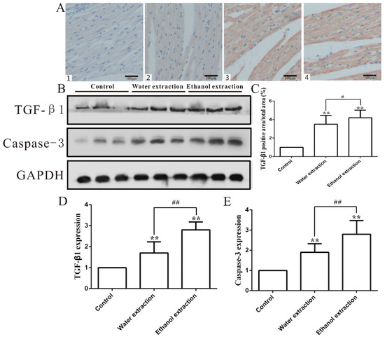 The TGF-β1 and caspase-3 expression levels in the heart tissues in control, water extraction, and ethanol extraction groups. (A) Representative figure of TGF-β1 immunohistological staining in heart (200×); 1: Negative group; 2: Control group; 3: Water extract group; 4: Ethanol extract group; (B) TGF-β1 and caspase-3 protein expression levels; (C) Statistic results of TGF-β1 immunohistological staining (n = 8); (D,E) Quantitative analyses of TGF-β1 and caspase-3 protein (n = 3); the protein expression levels were determined by Western blot analyses and relative band intensities were analyzed by the Image J software (a common image processing software); data are expressed as mean ± SD. ** p < 0.01 vs. control group; # p < 0.05, ## p < 0.01 vs. water extraction group.