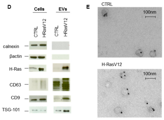 2.1. Analysis of H-RasV12 and Control Fibroblasts Released EVs by Immunoblotting and Immuno-TEM