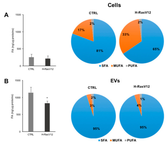 Fatty acid content and distribution of SFA, MUFA and PUFA in control and H-RasV12 cells (A) and their released EVs (B). Lipids were extracted and total fatty acids analysis was carried out by GC-MS. In the graphs are reported the amounts of total fatty acids relative to protein content. Data are expressed as ng of FA/µg of proteins and are presented as mean ± SD (n = 6) (* p < 0.05, control vs. H-RasV12). In the pie charts are reported the proportion of fatty acids grouped on the basis of their unsaturation level; SFA: saturated fatty acids; MUFA: Mono-unsaturated fatty acids; PUFA: Poly-unsaturated fatty acids.